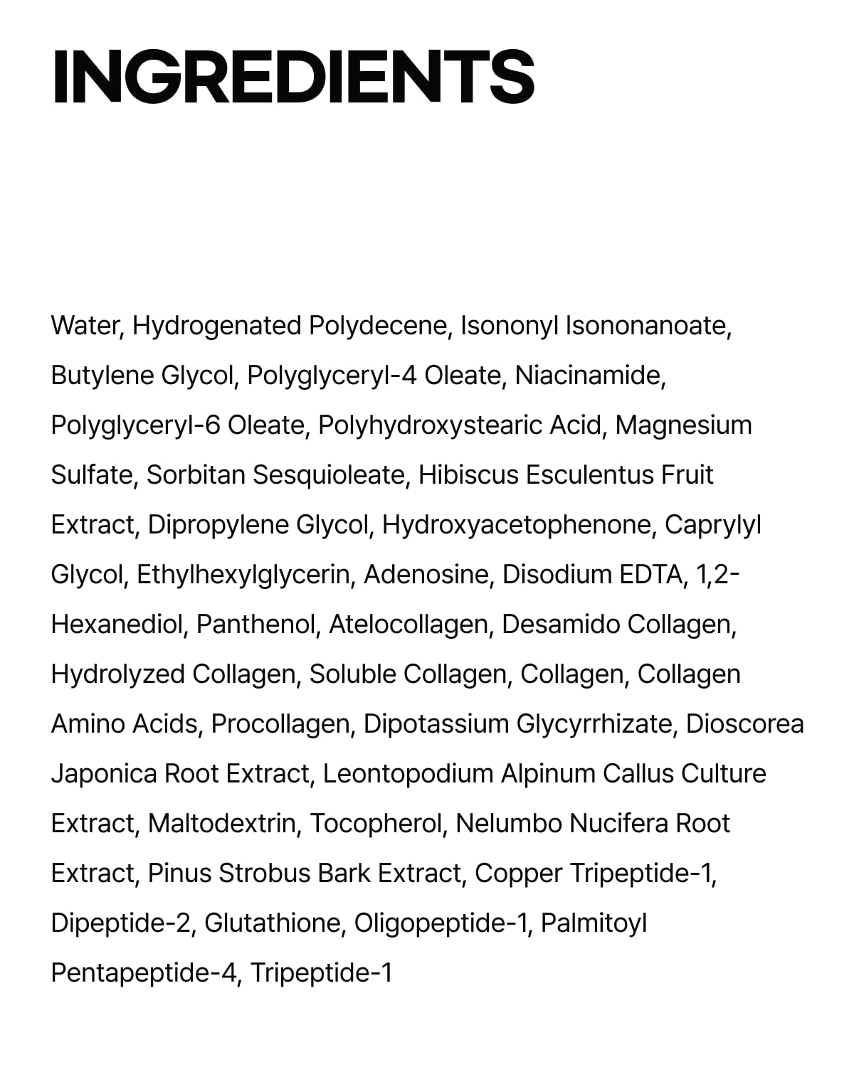Atelocollagen, Hydrolyzed Collagen, Soluble Collagen – Enhances firmness, elasticity, and smoothness