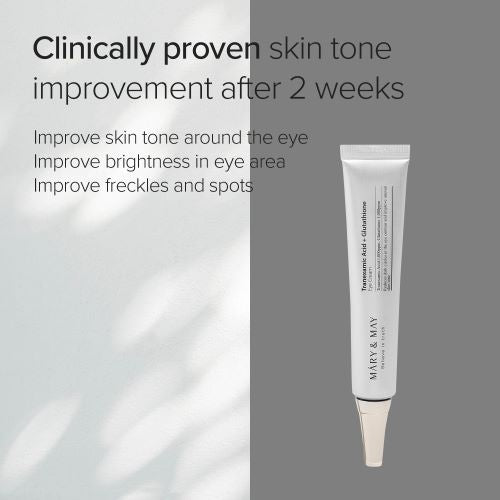 Restore brightness and vitality to the delicate eye area with Mary & May Tranexamic Acid + Glutathione Eye Cream, a targeted treatment designed to reduce dark circles, improve skin tone, and smooth fine lines. This advanced brightening eye cream combines powerful ingredients to help visibly illuminate the under-eye area while maintaining hydration and skin comfort.